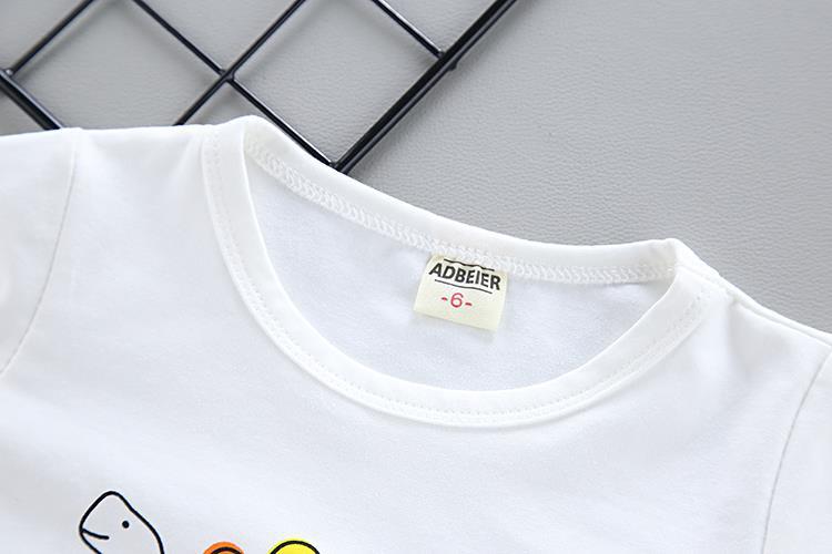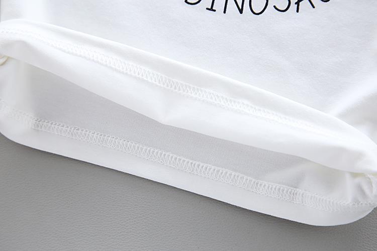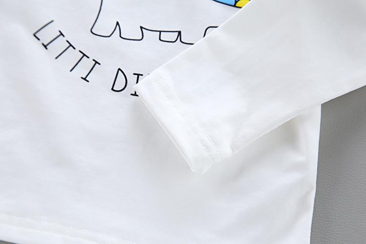 – Бяла тениска от мек памук с весел принт на динозавър и цветна графика с надпис. Свободната кройка и кръглото деколте осигуряват комфорт през целия ден.