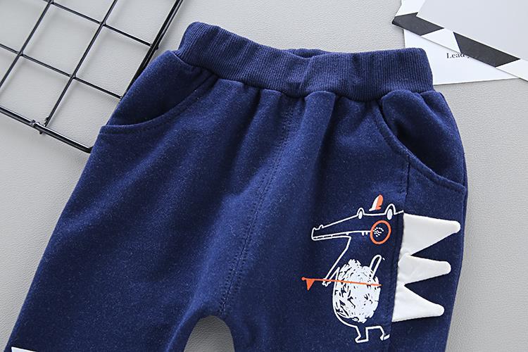 – Панталон в тъмносин цвят с щампи и апликации на зъбки от едната страна и бродерия с динозавърче от другата. Крачолите са с ластични маншети – за комфорт и свобода на движение.
