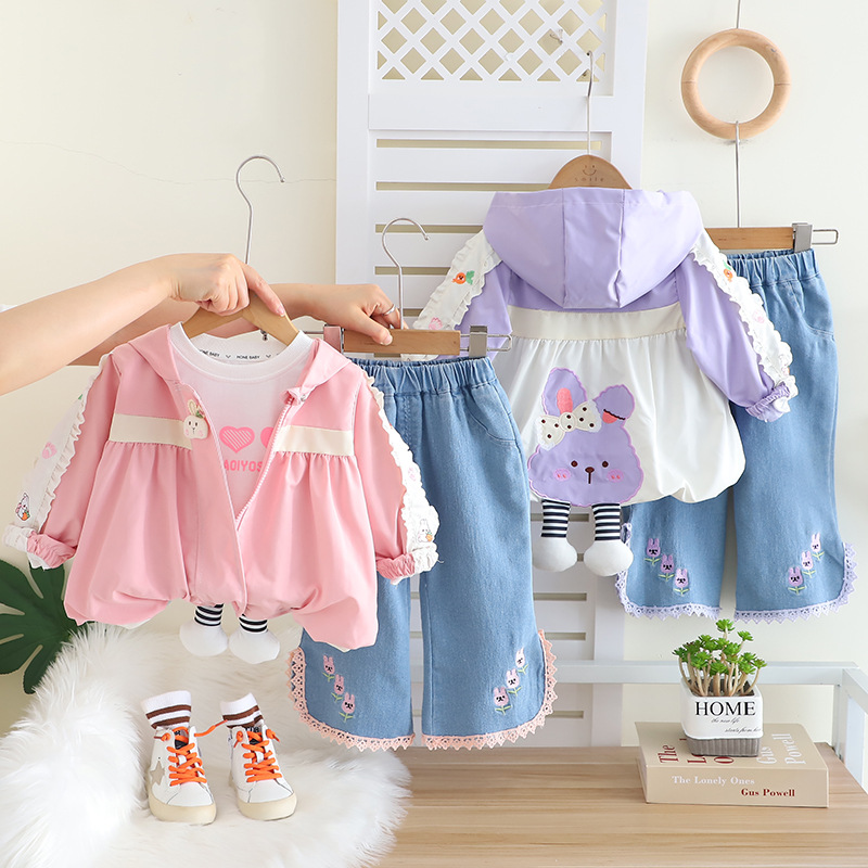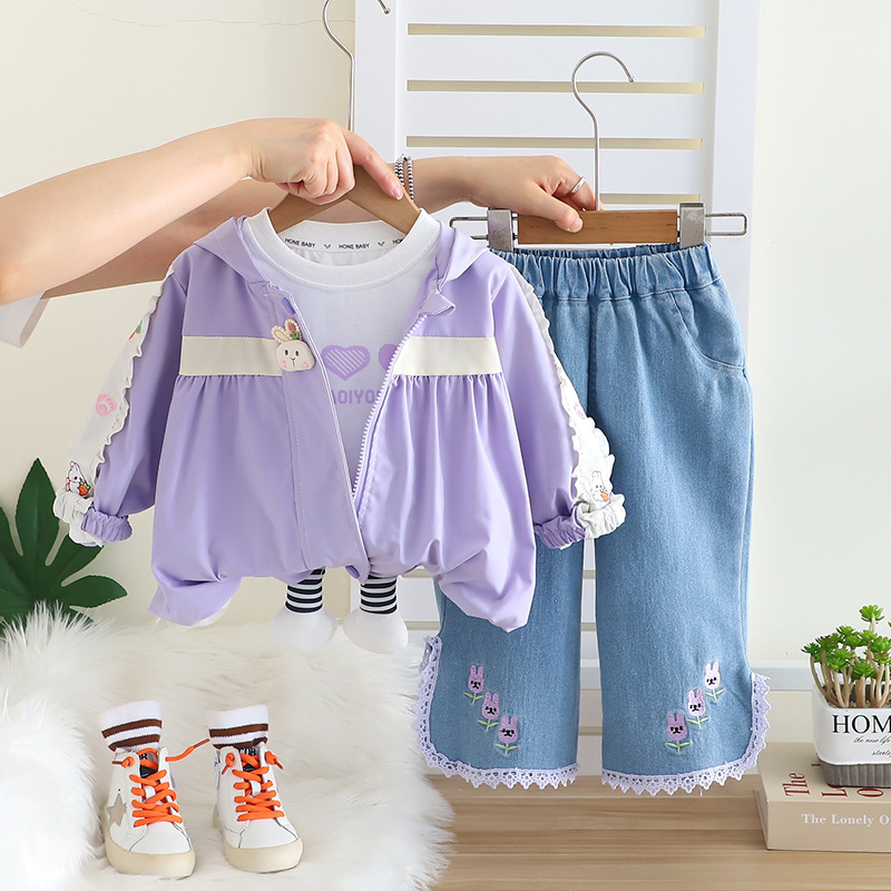 Комплект от Яке с Качулка, Блуза и Дънков Панталон с Бродерии и Дантела Pastel Jolie Lilac – 3 части