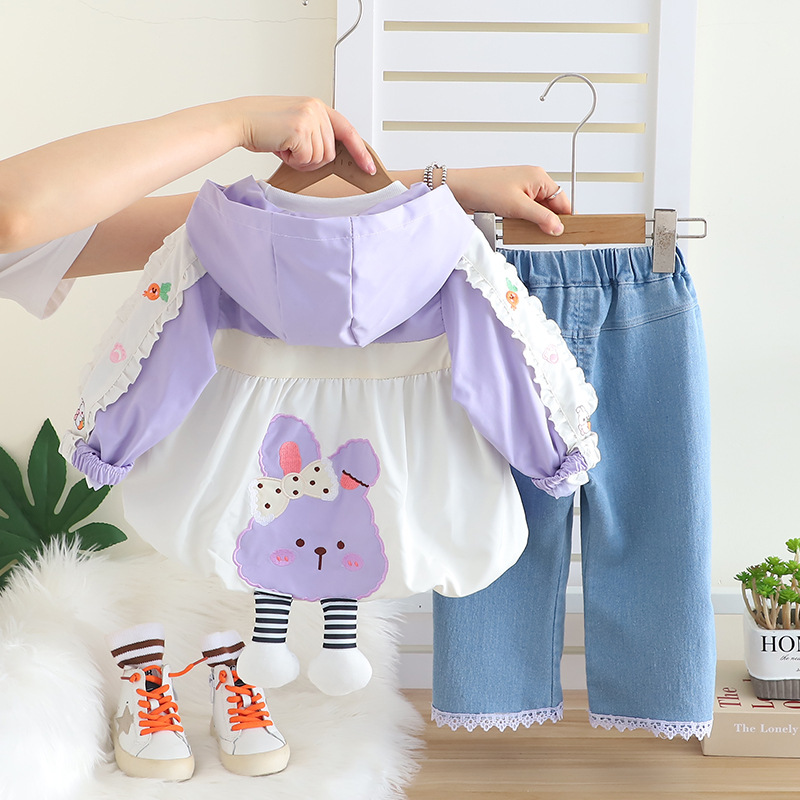 – Яке тип ветровка с качулка, в лавандулово-лилав цвят, изработено от лека, непромокаема материя. Моделът е с широк силует и ефектен набор под бялата лента на гърдите. Ръкавите са декорирани с бели къдри и бродирани зайчета, които добавят чар и сладост. Закопчава се с цип и е подходящо за пролетни разходки. Акцента на модела се намира на гърба и представлява голяма апликация на зайче с 3Д крачета.