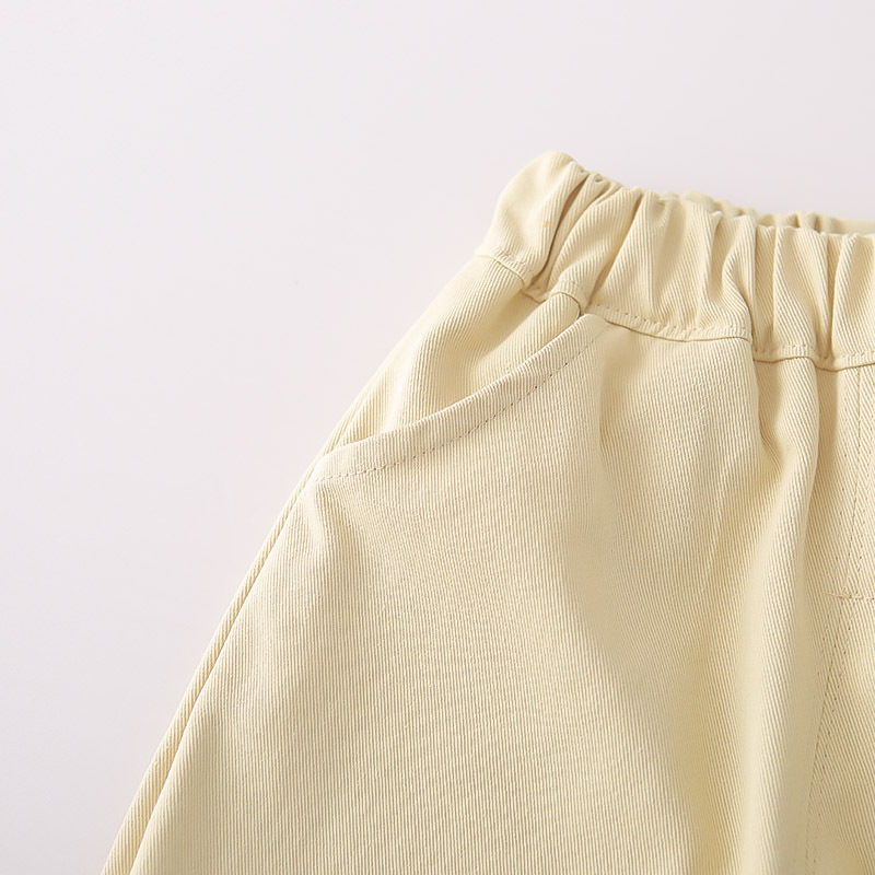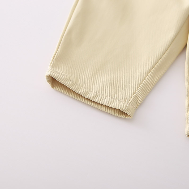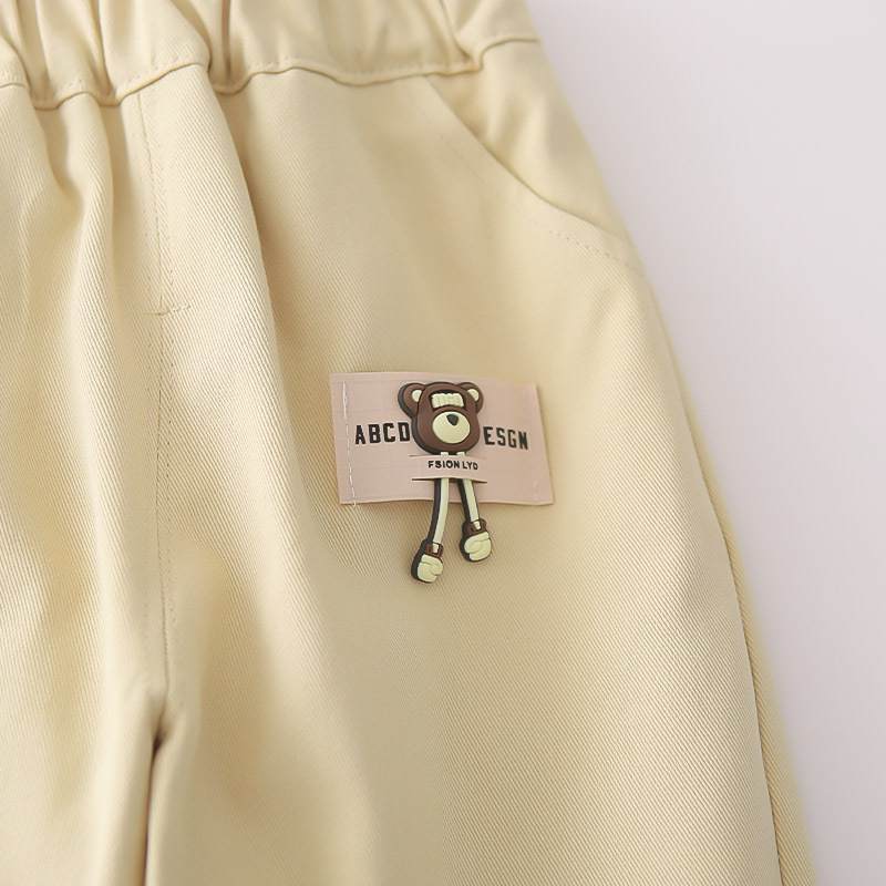 – Панталон в същия бежов тон, с ластик в талията и глезените и навити крачоли за по-небрежен вид. Декориран е с текстилна емблема с мини маймунка и буквички – закачлив и фин акцент.