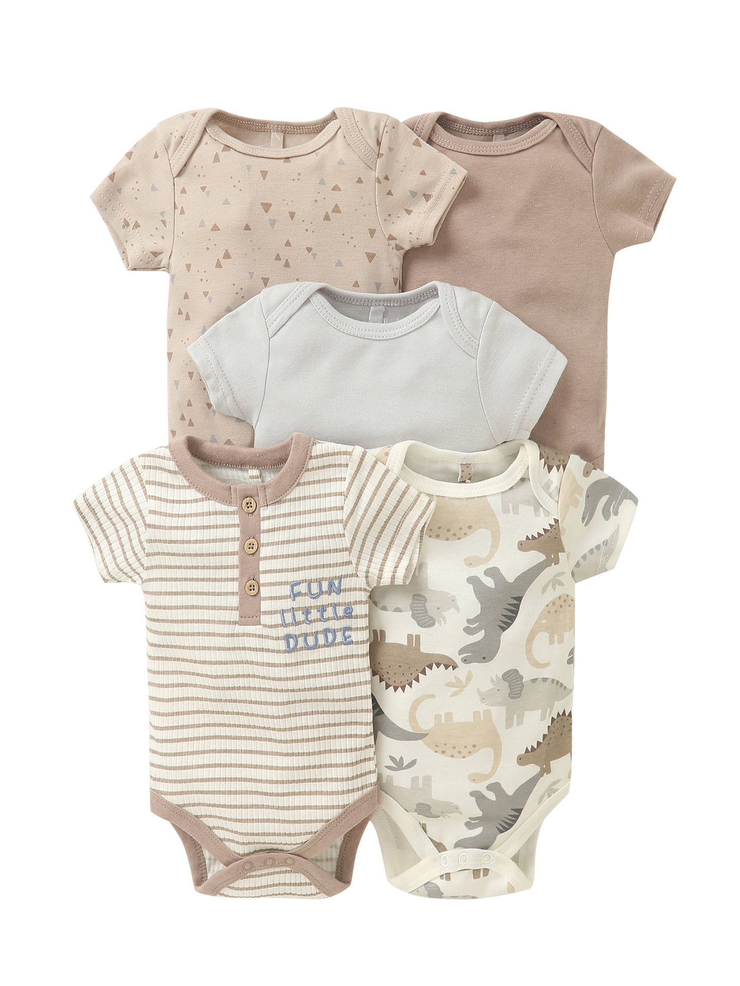 🦕 Комплект от 5 броя бодита с къс ръкав за момче – съчетание от мекота, неутрални цветове и закачливи щампи.