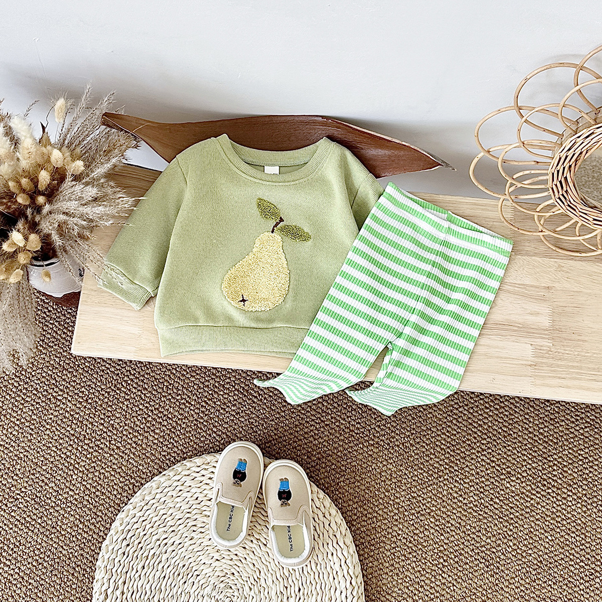 -Блузка тип суитшърт, изработена от фино рипсено плетиво в свеж зелен цвят, с акцент – голяма плюшена апликация на круша отпред, мека, обемна и изключително чаровна; кройката е свободна, с леко спуснати рамене и еластични маншети за максимален комфорт