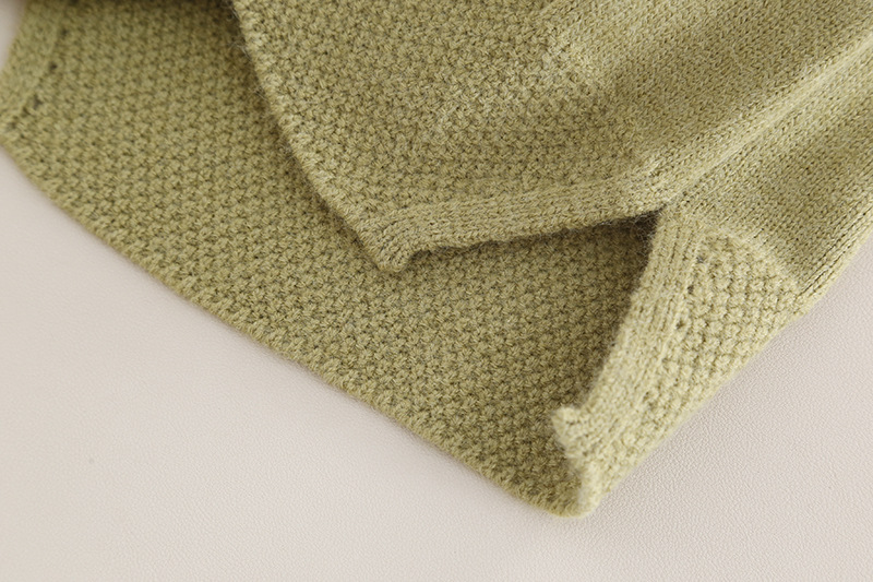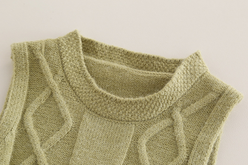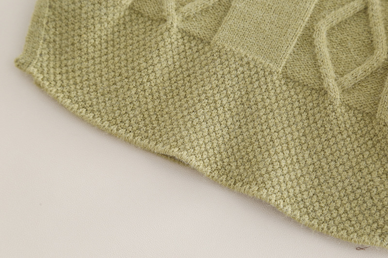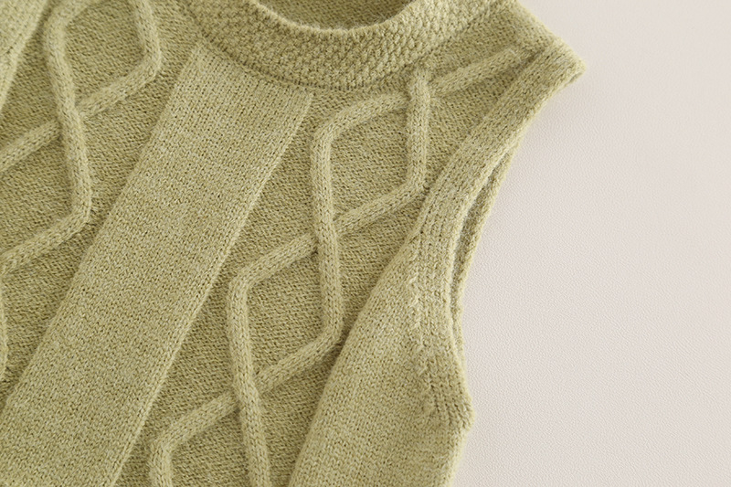– Елек от плетиво в пастелно зелено, с елегантна текстура на ромбоидни плитки и леко скосен подгъв. Изработен от фино плетиво – чудесен за връхна дреха през пролетта и есента.