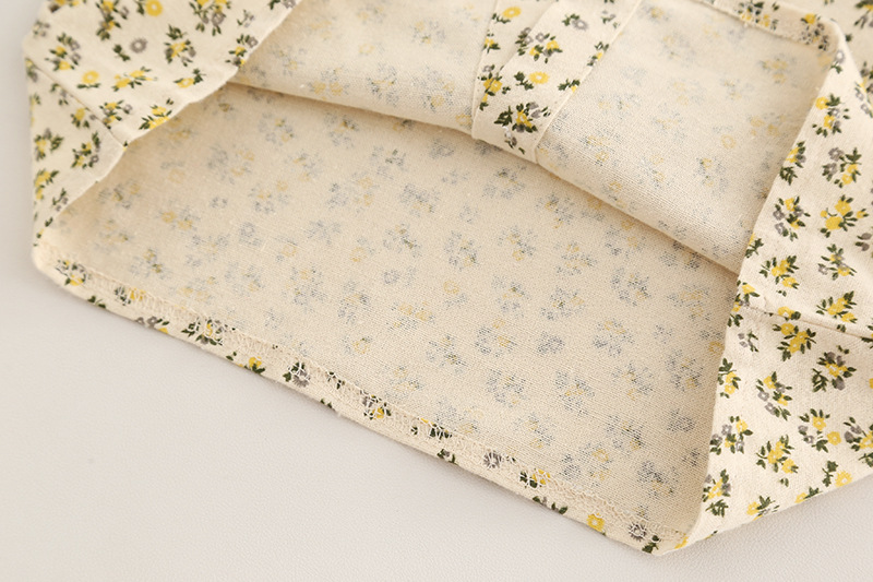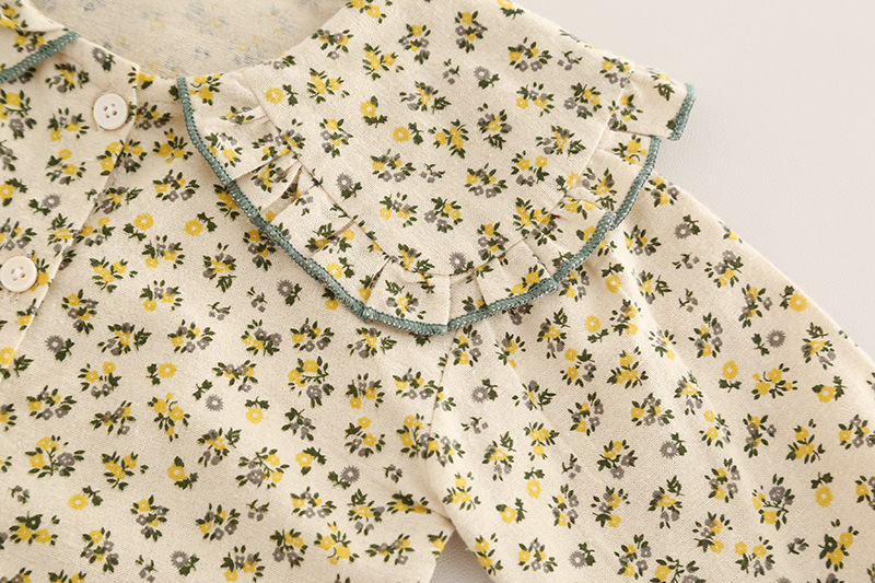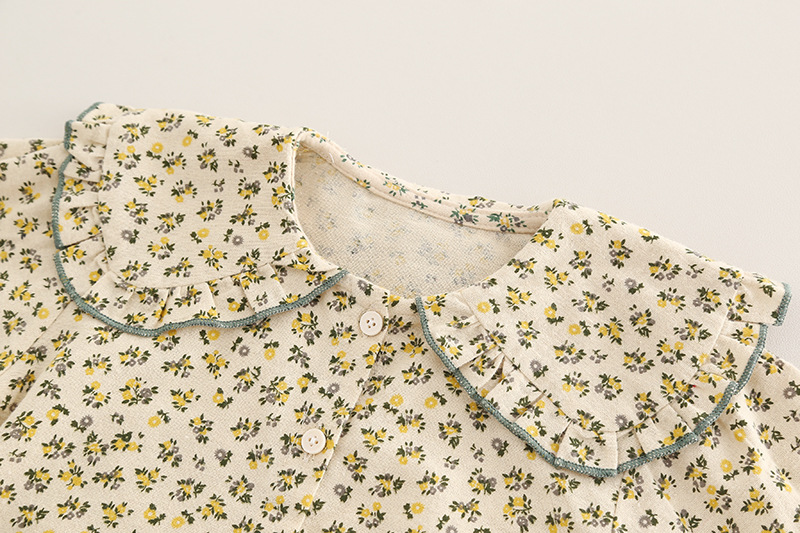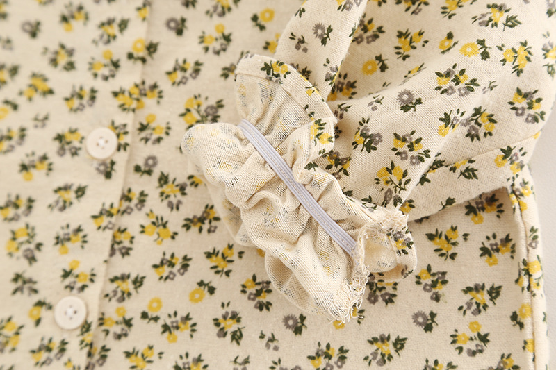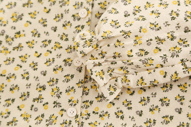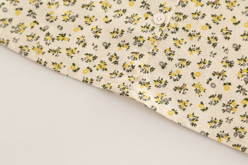 – Риза от памук с флорален принт, в кремава основа и миниатюрни жълто-зелени цветчета. Моделът е с ефектна яка тип „Питър Пан“ с къдри и контрастен кант, както и фино набрани ръкавчета с ластик – създава усещане за приказен стил.