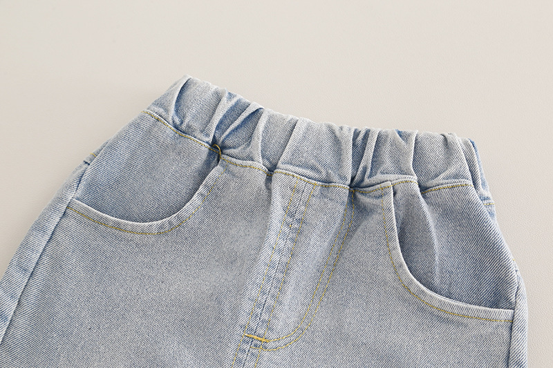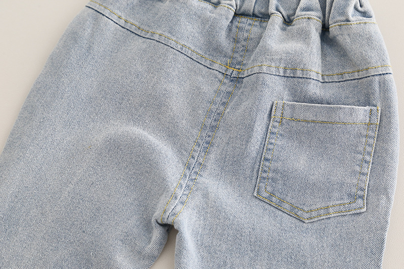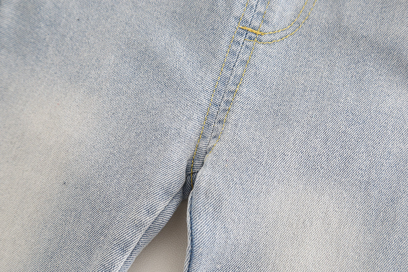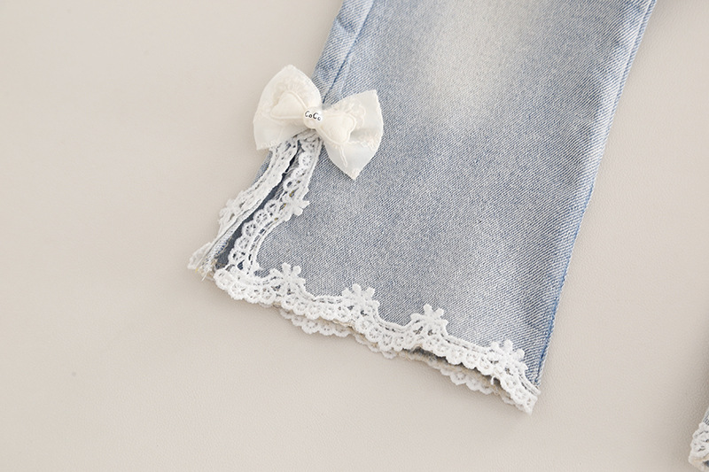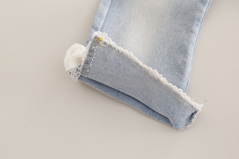 – Дънков панталон в светъл син нюанс, с права кройка и нежни дантелени апликации и панделки по краищата на крачолите. Талията е с ластик, а дължината е идеална за пролетни комбинации с кецове или балеринки.