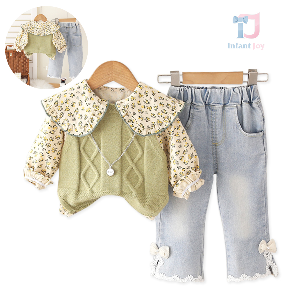 Комплект с Елек от Плетиво, Цветна Риза и Деним Панталон с 3Д Елементи Garden Stroll – 3 части