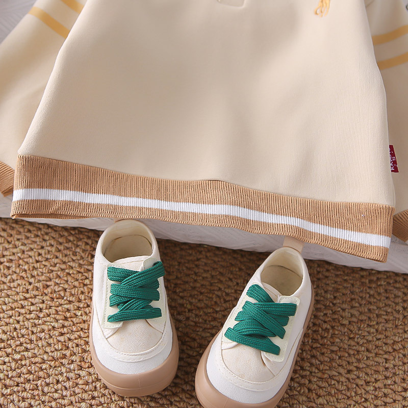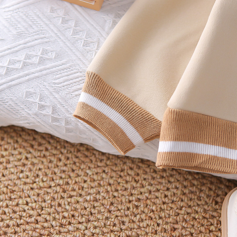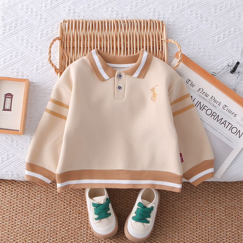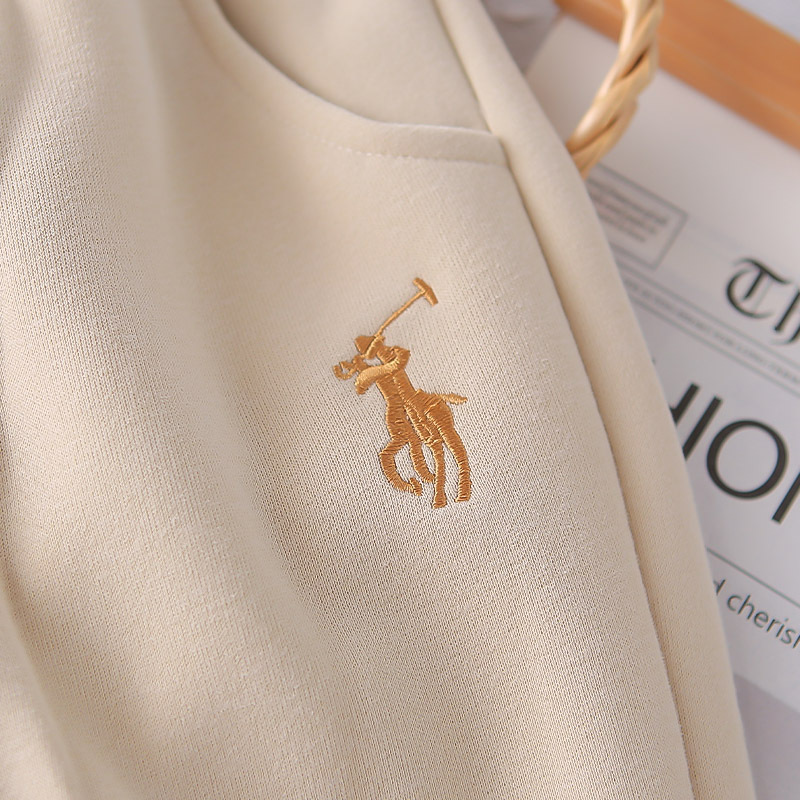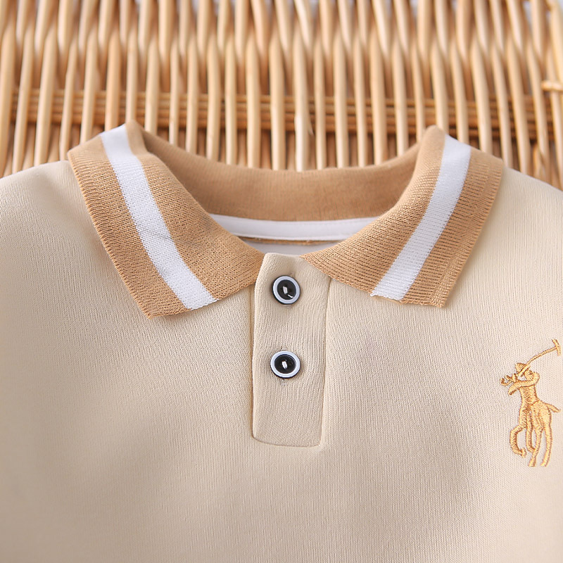 – Суитшърт от мек памучен плат в топло бежово, с класическа яка. Закопчаване с две копчета на деколтето, контрастно райе на яката и рипсени маншети – за сигурно прилягане. Дискретна бродерия „поло ездач“ на гърдите.