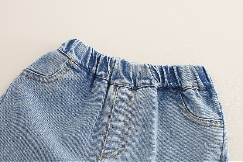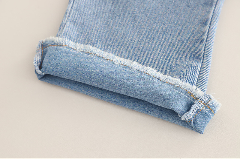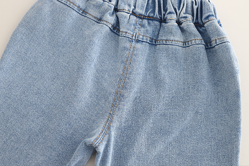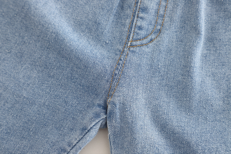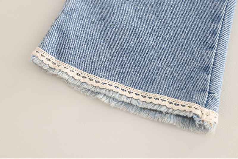 – Дънков панталон тип „Чарлстон“ в светъл деним с еластична талия. Широки крачоли с леко разширение и фин дантелен кант на подгъва за романтичен акцент.