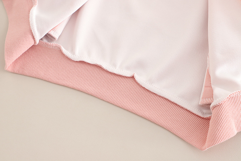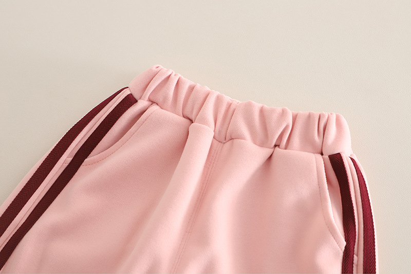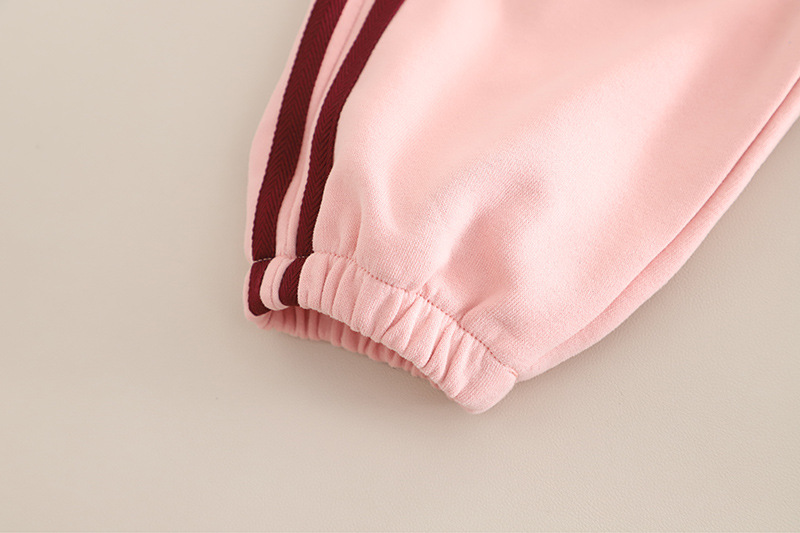 – Панталон в нежнорозово със същите контрастни тъмночервени кантове по страничните шевове. Еластична талия за лесно обуване, два странични джоба и ластични маншети на глезените. Добавено лого на бедрото.