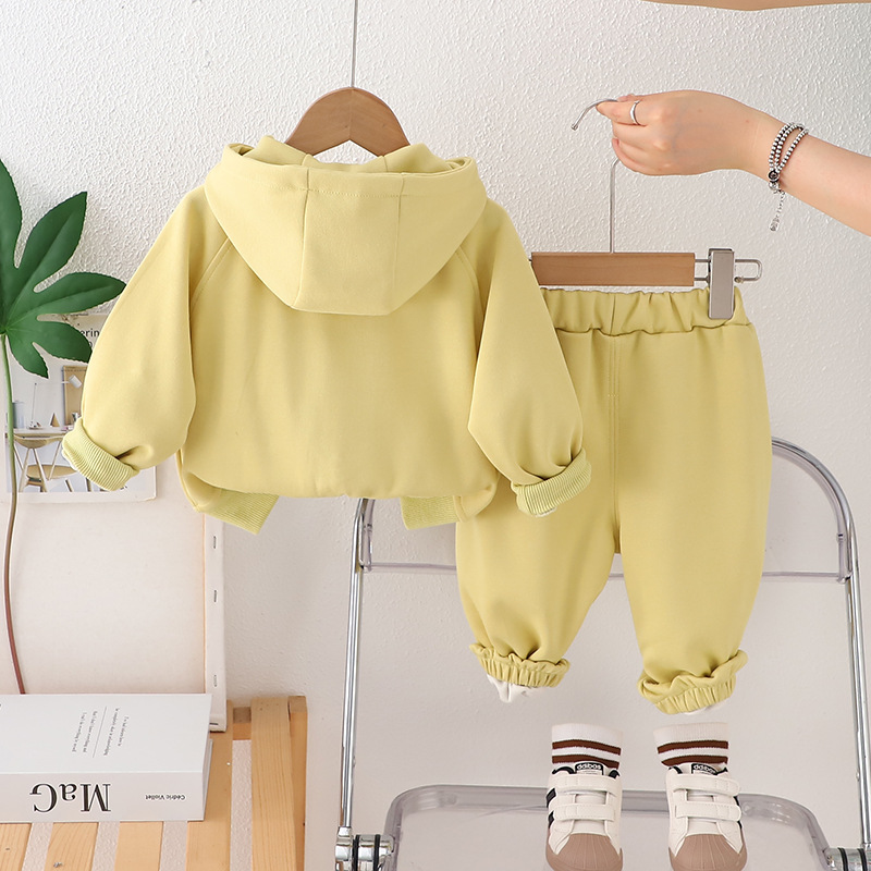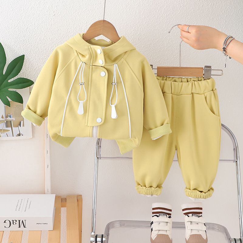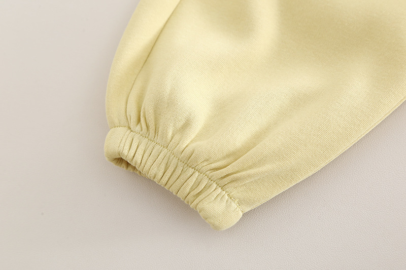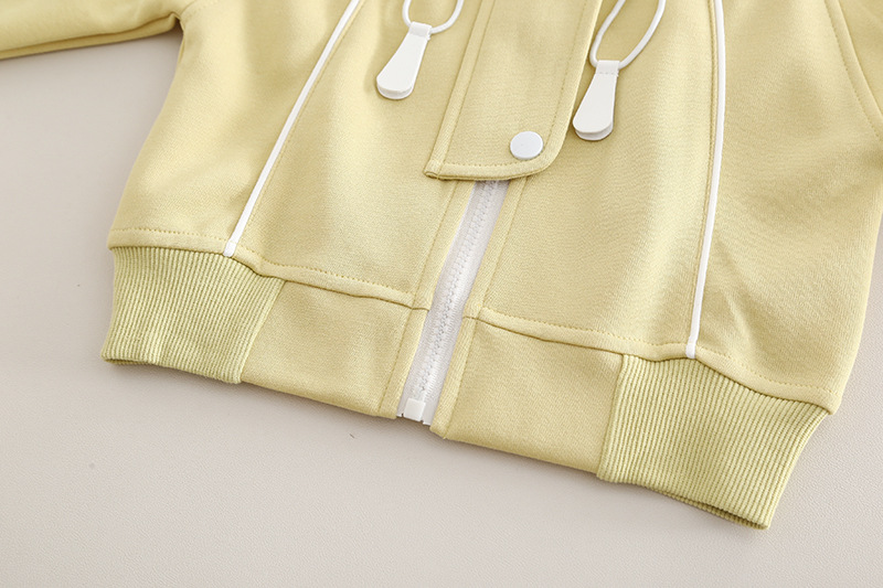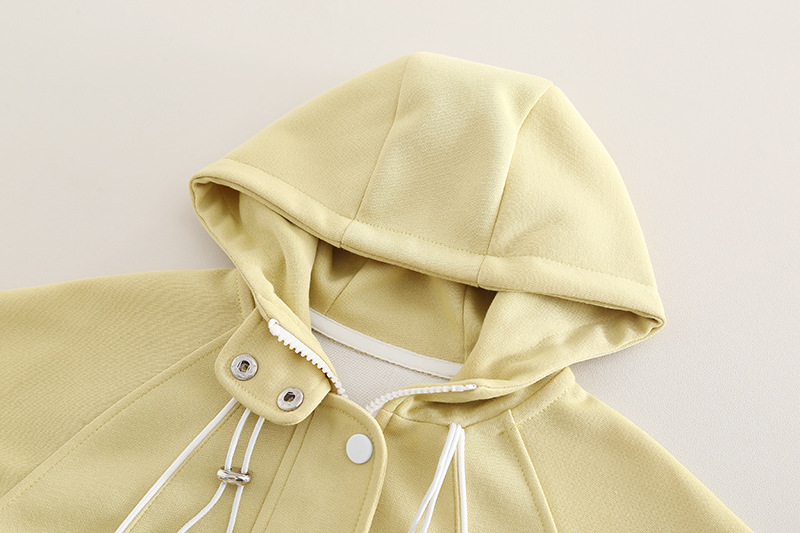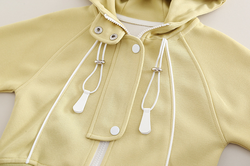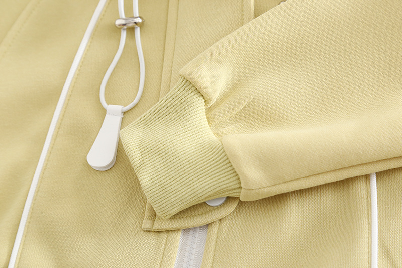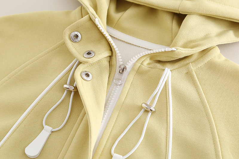– Суитшърт с качулка в светложълт цвят, изработен от меко, плътно трико. Моделът е с функционален цип и допълнително прихлупване с декоративни тик‑так копчета в бяло. Контрастните бели шнурове и елементи придават модерен, почти „техно“ облик. Ръкавите са с ластични маншети, подсилващи удобството.
