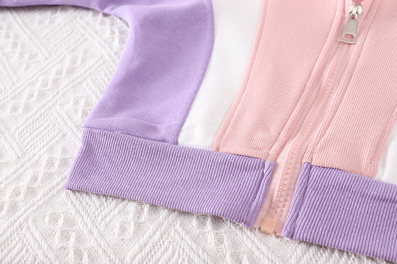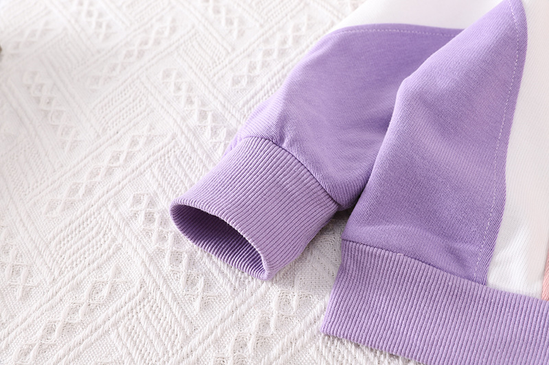 – Горна част тип суитшърт от мека памучна материя. Модел с качулка и цип по цялата дължина. Кройката е свободна, с дълги ръкави и еластични маншети. Декориран с широки геометрични елементи в бяло и лилаво в предната част и ръкавите.