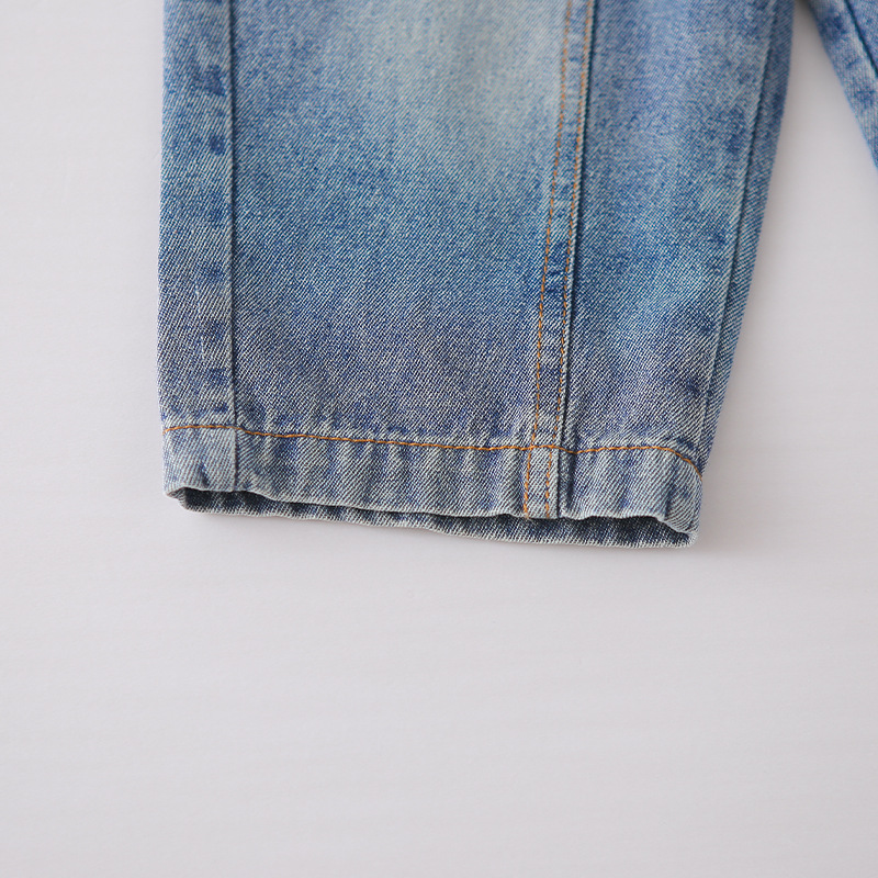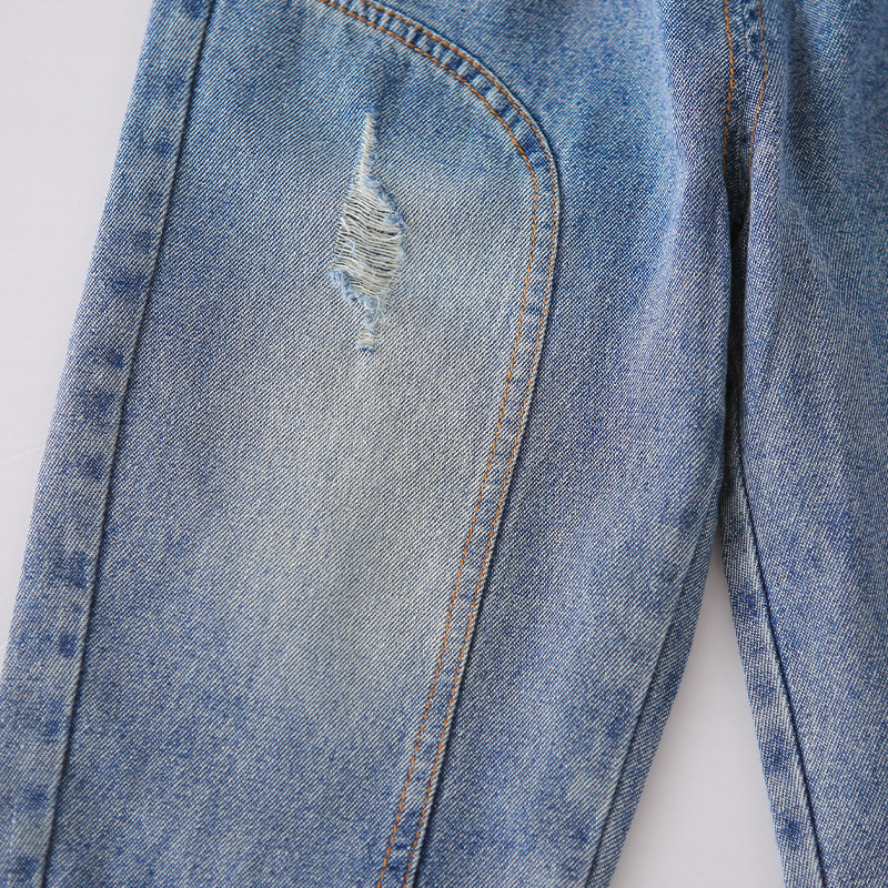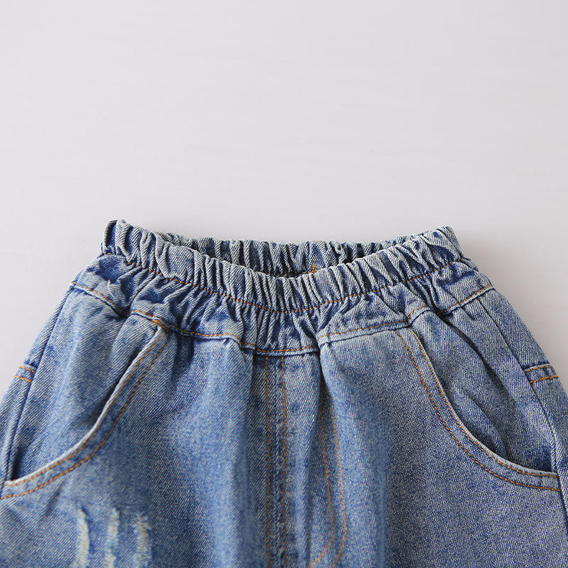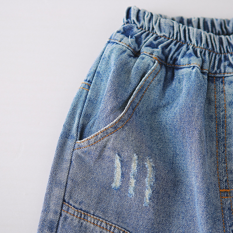 – Панталон в деним стил със свободна кройка и ластик в талията за комфорт при движение. Декориран с протрити зони на единия крачол за модерен вид.