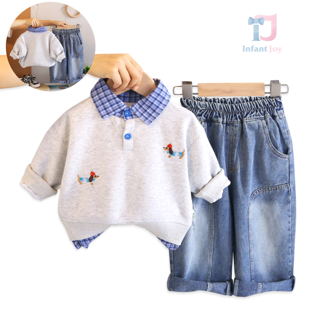 – Горна част тип блузка/суитшърт от мека памучна материя в сив меланж, с пришита синя яка и контрастна долна част в карирано синьо – създава ефект на риза под блуза + две копченца. Декорацията включва малки бродирани кученца върху скейтборд.