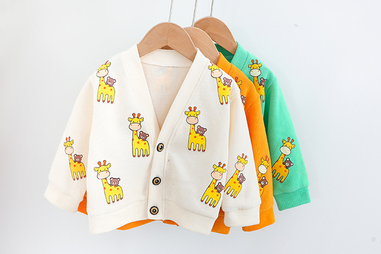 -Жилетка от фино машинно плетиво в бежов цвят с щампи на жирафи и мечета. Модел с пълно предно закопчаване посредством копчета.