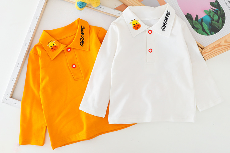 -Оранжева памучна блуза с класическа яка и весела апликация на жирафче, плюс надпис за още повече чар.