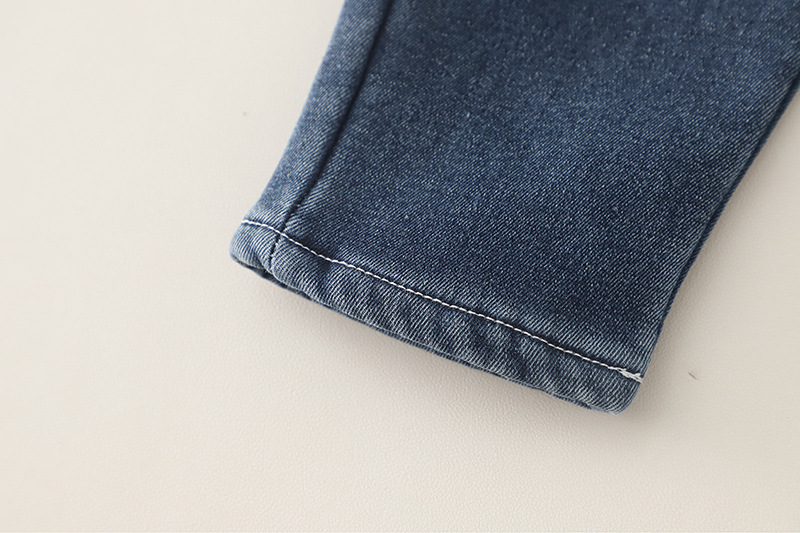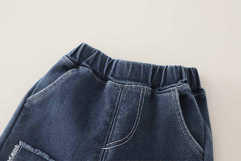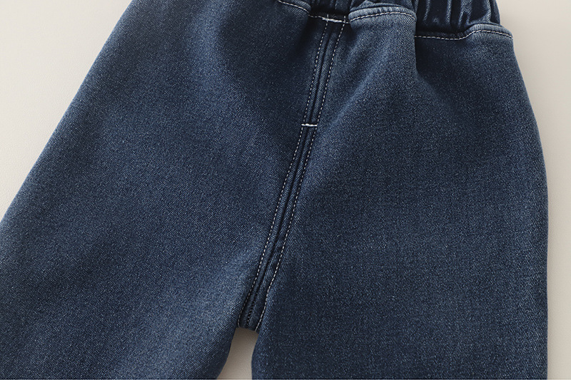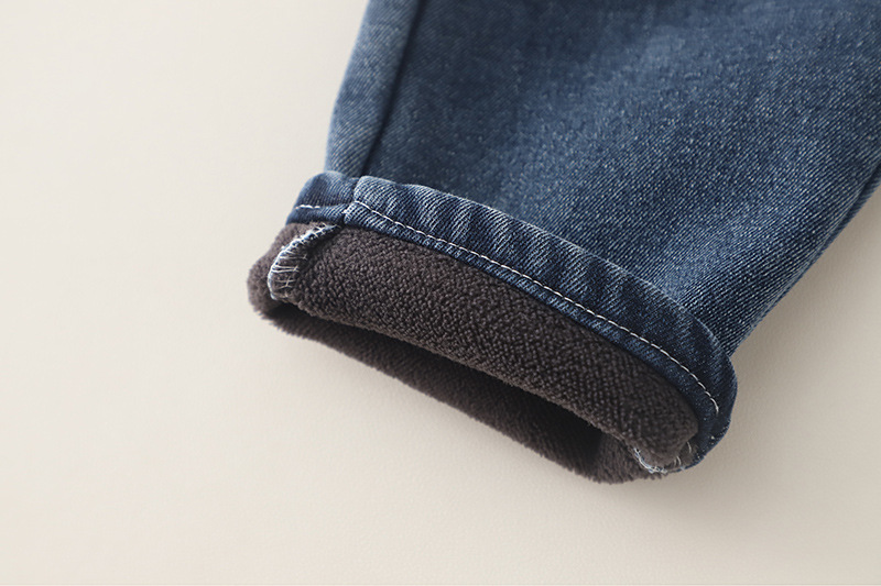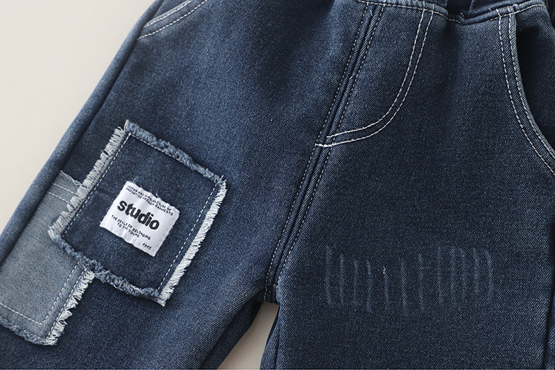 – Дънков панталон в тъмносиньо с леко избелял ефект, контрастни декоративни кръпки и ластичен колан. Меката вътрешна подплата го прави чудесен избор за хладните дни.