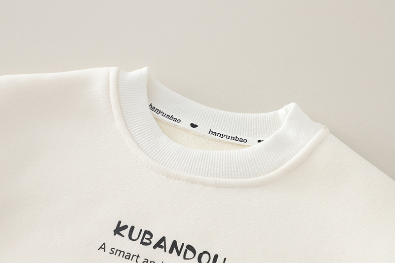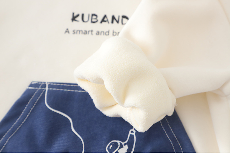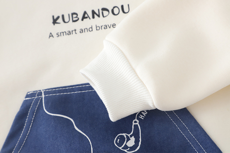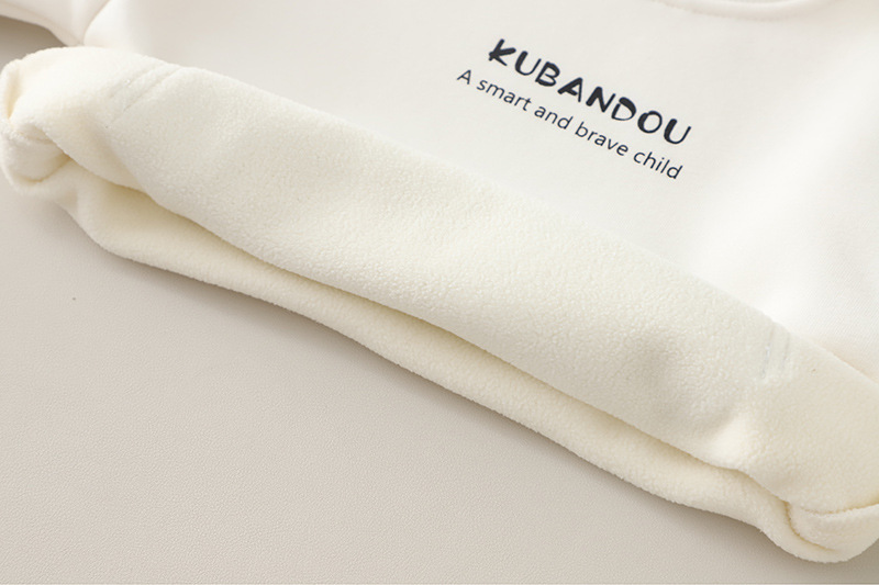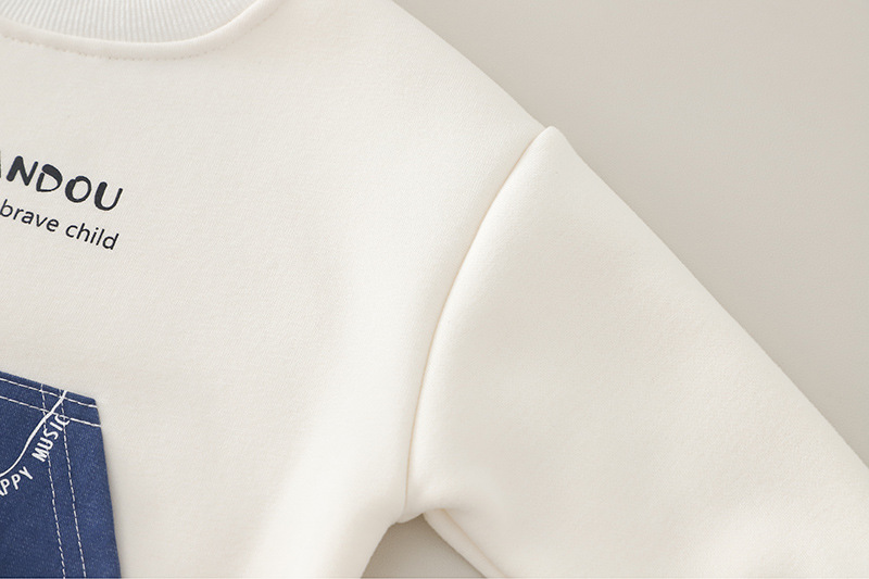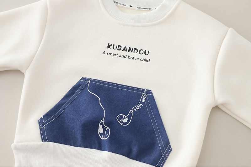 – Блузка/суитшърт в екрю сатиран нюанс с рипсена яка и ефектен преден джоб тип „кенгуру“ в дънков стил, декориран с апликация на слушалки и надпис „A smart and brave child“. Подходяща за ежедневно носене, с мека ватирана вътрешност за допълнителна топлина.