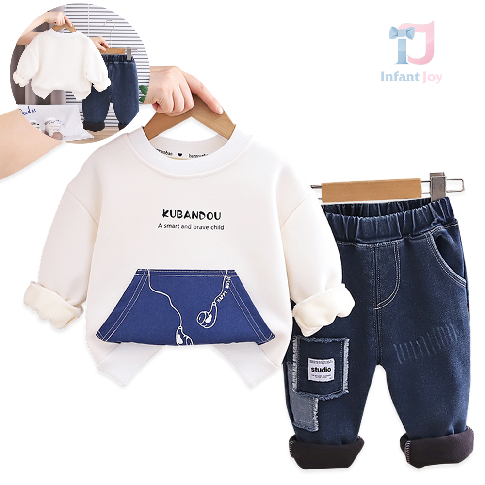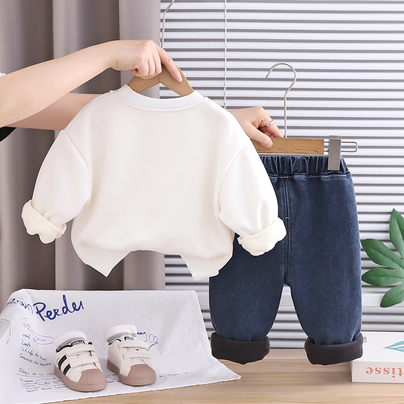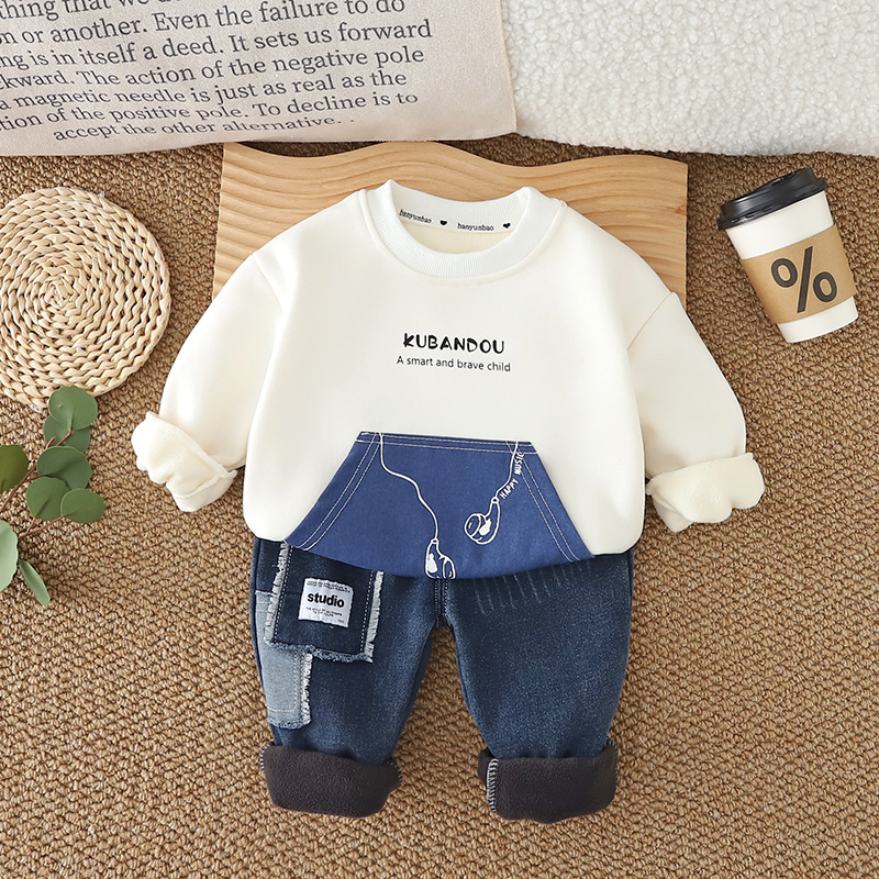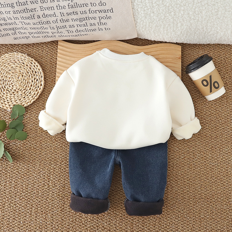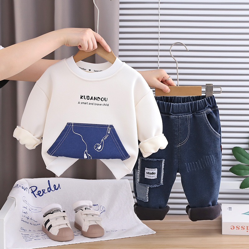 Premium Ватиран Комплект от Блузка/Суитшърт с Джоб Тип „Кенгуро“ и Деним Панталон Indigo Sound – 2 части