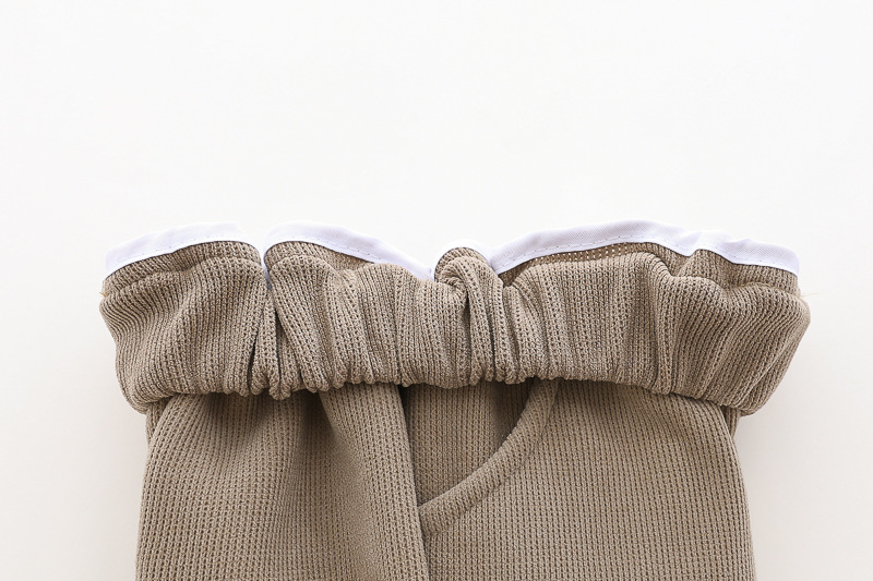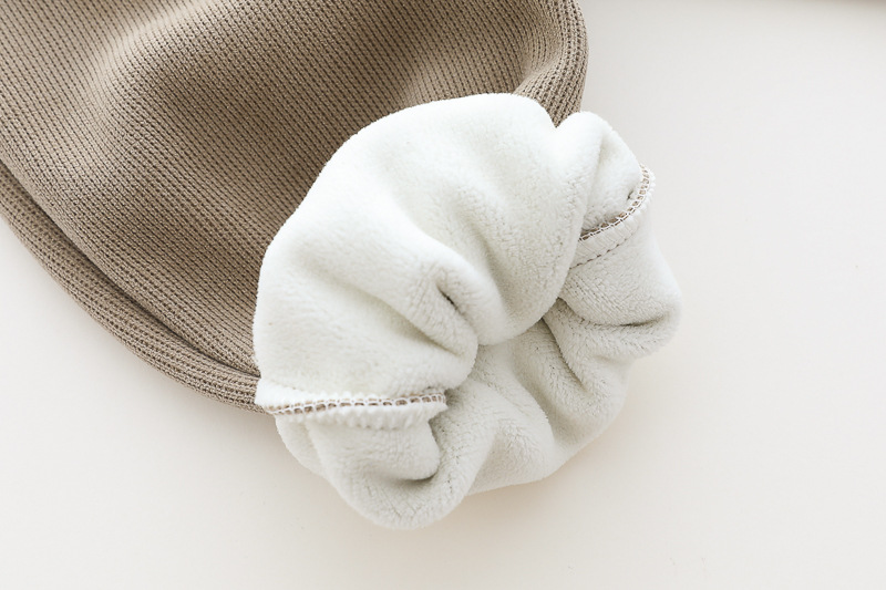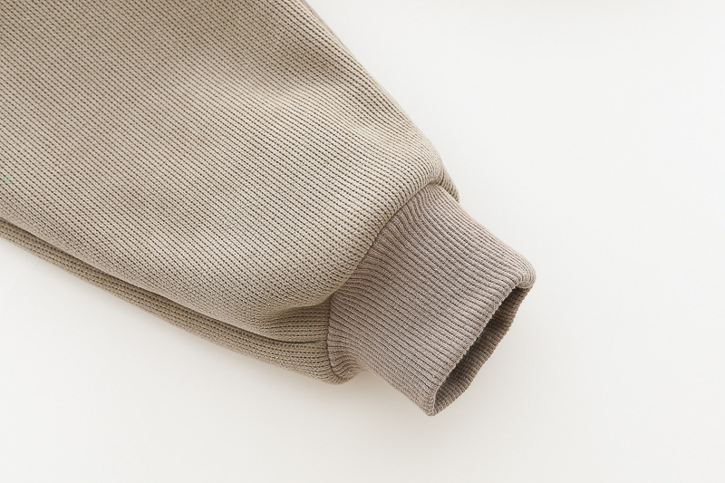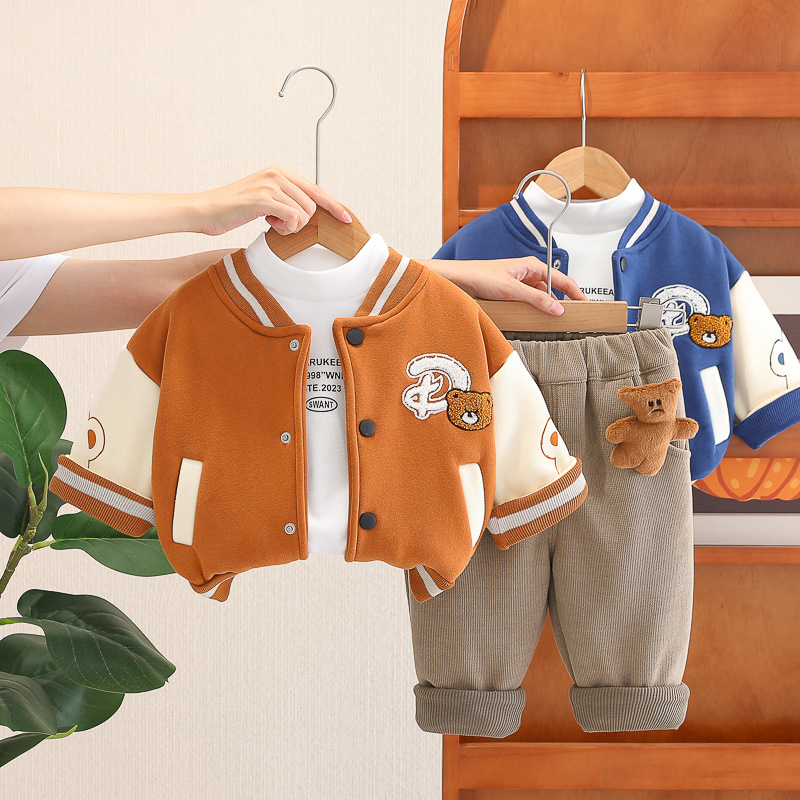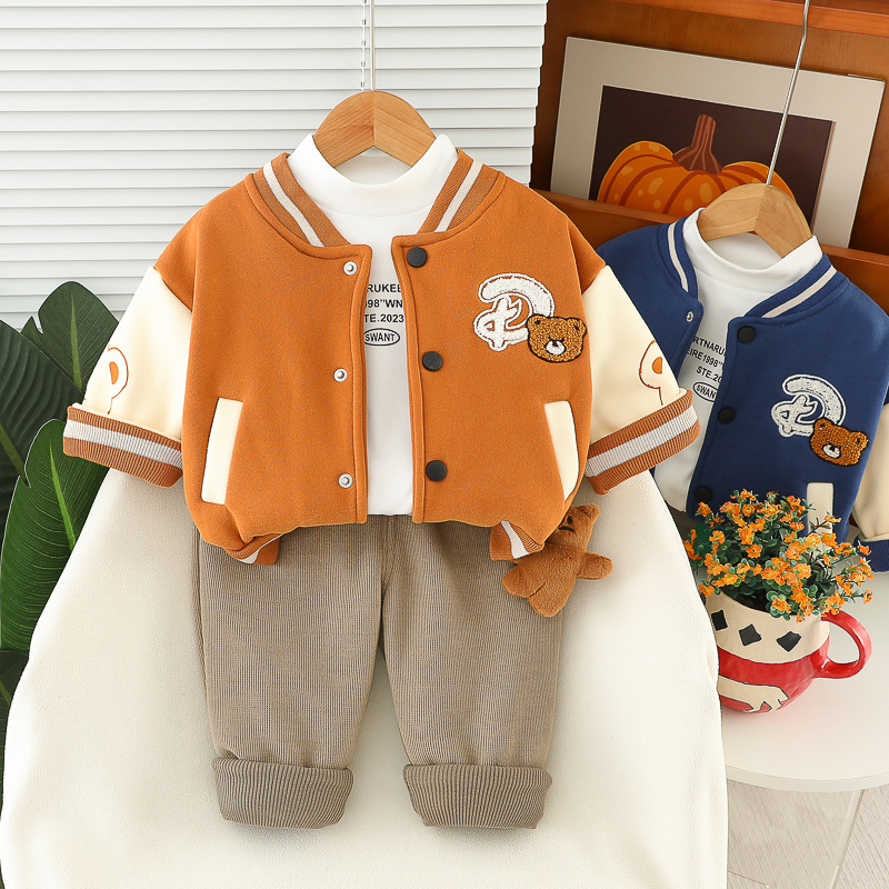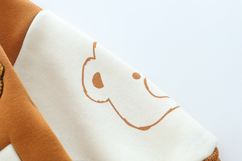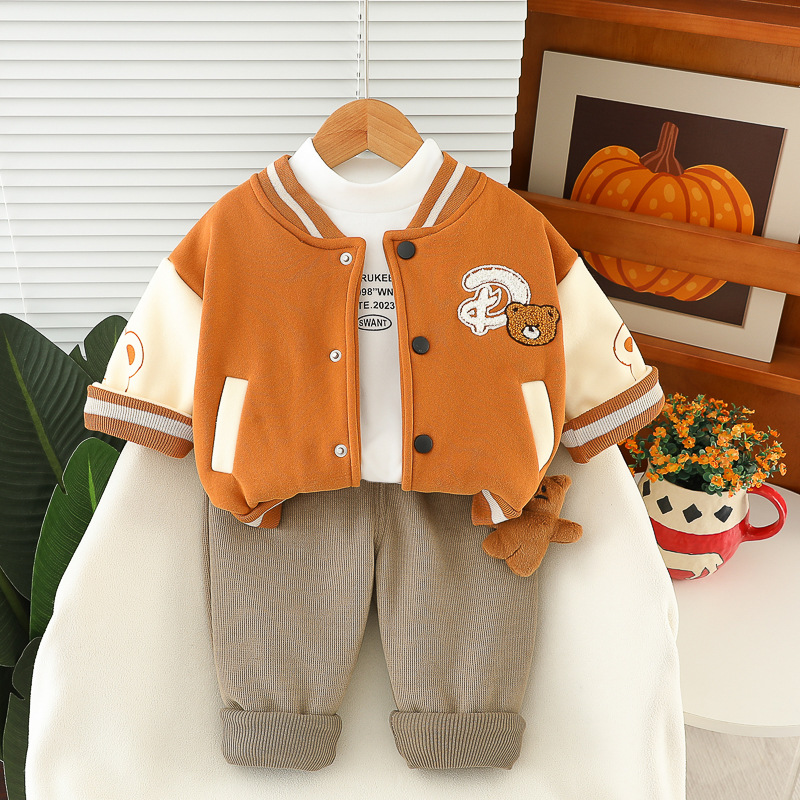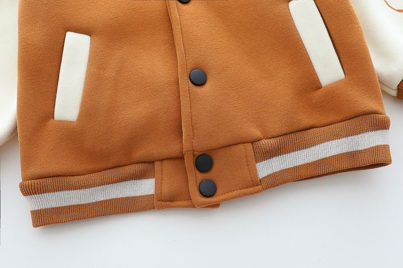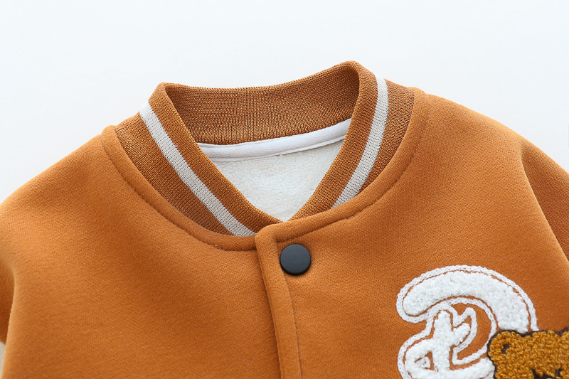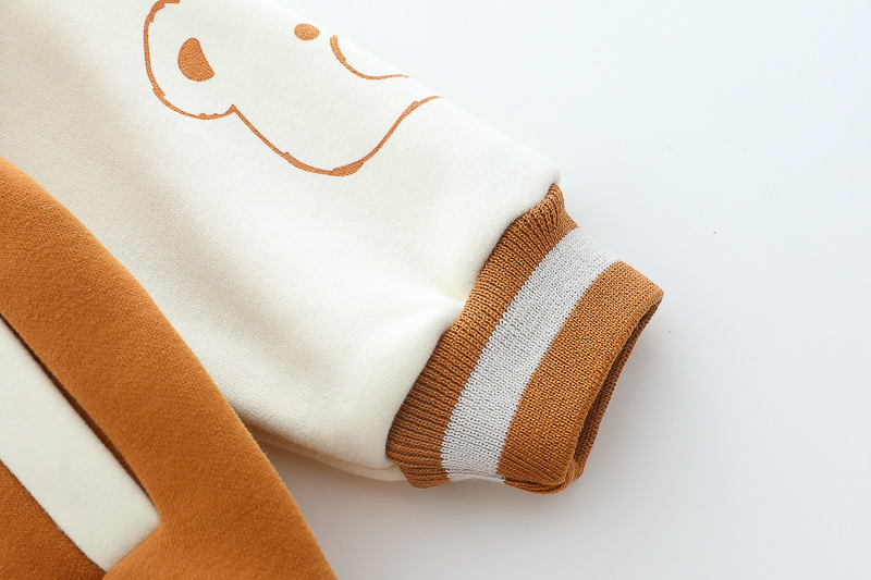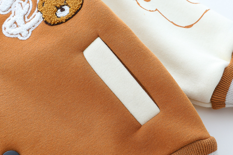 – Ватирано яке тип „бомбър“ в карамелен и кремав цвят, с контрастни рипсени елементи, спортна яка и тик-так копчета. Декорирано е с плюшена апликация на мече и буква, които придават игрив характер и отличителен стил.