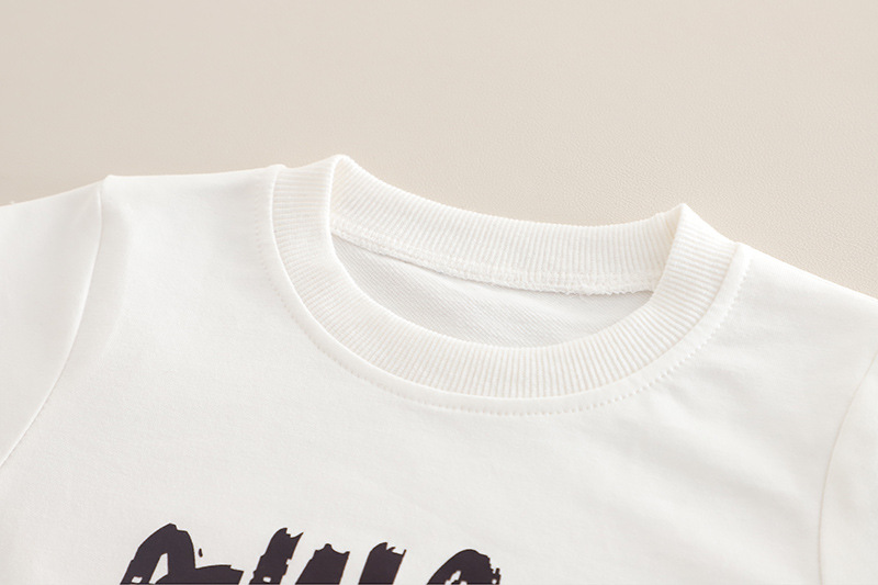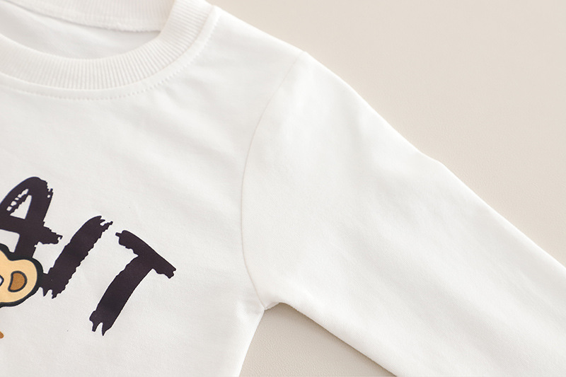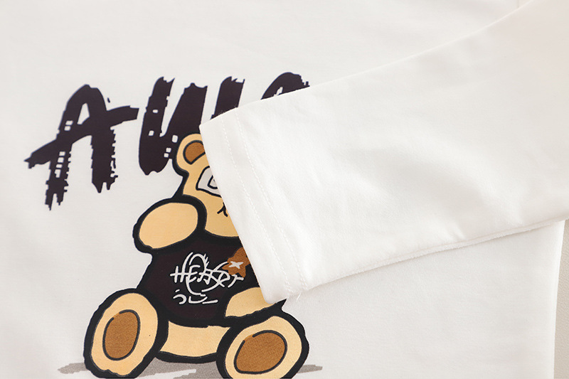 – Блузка от памук в бял цвят със закачлива щампа на мече и надписи отпред. С обло деколте и мека материя за целодневен комфорт.