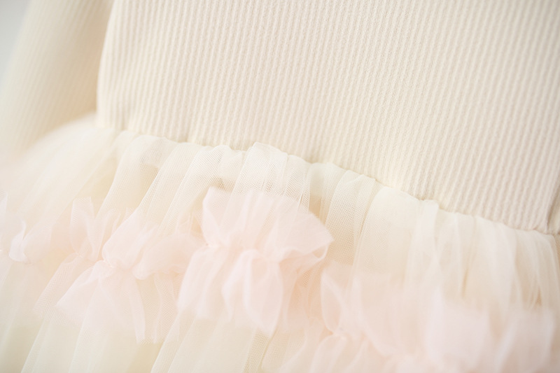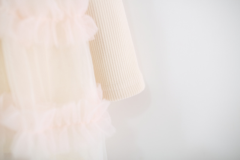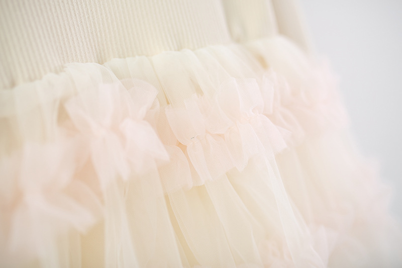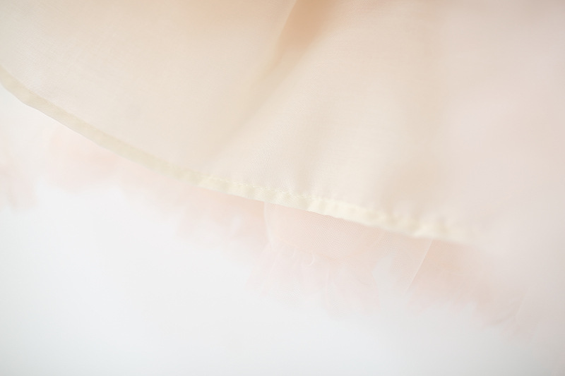 – Рокля в екрю цвят от нежен памучен рипс в горната част. Модел с много пластове тюл, украсен с фини бледорозови къдри – създава приказно обемна и ефирна визия. Памучна подплата за комфорт и удобство при носене.