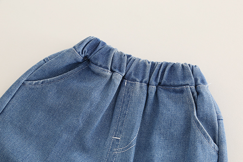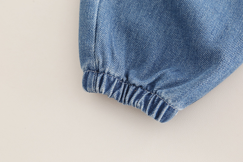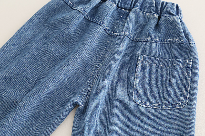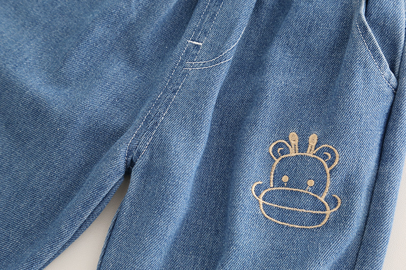 –Дънков панталон със свободна кройка в средносин нюанс, с ластик в талията и на глезените, малка бродерия отпред за анималистичен акцент, който допълва темата.